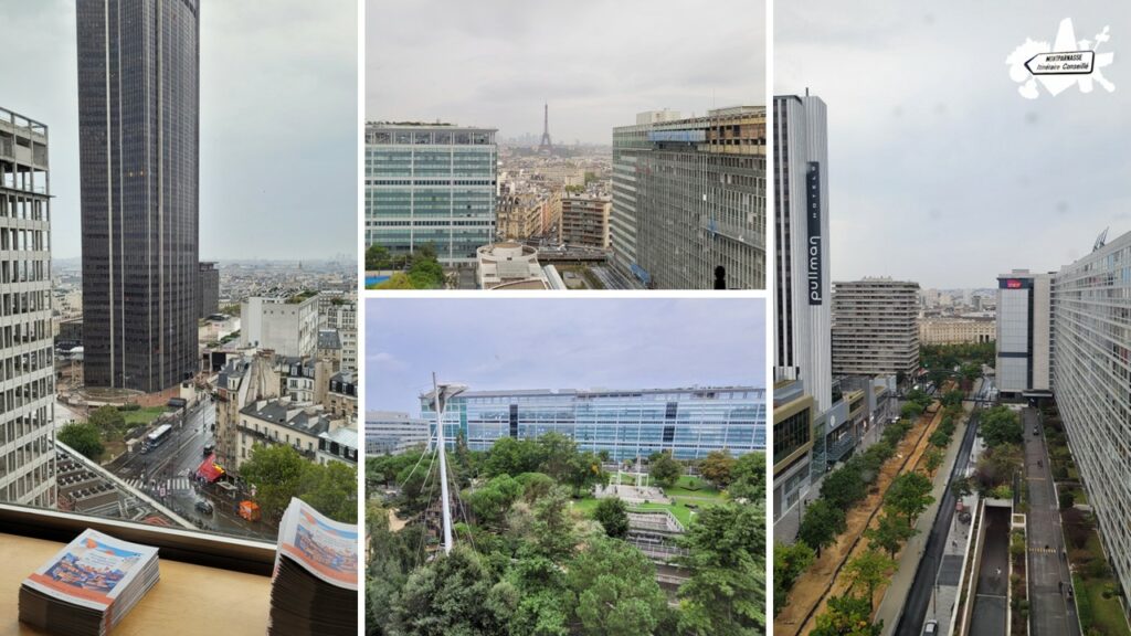 A gauche : la gare Montparnasse et le jardin Atlantique vus depuis la Tour Montparnasse (octobre 2013). L’immeuble Mouchotte est celui en forme de L inversé, le long du côté gauche du jardin Atlantique (Photo : Matthias Nonnenmacher – Source : Wikimedia Commons, CC BY 4.0) A droite : les différents secteurs du projet Maine-Montparnasse. Le secteur II est l’immeuble Mouchotte (crédit : LNP – source : YouTube)